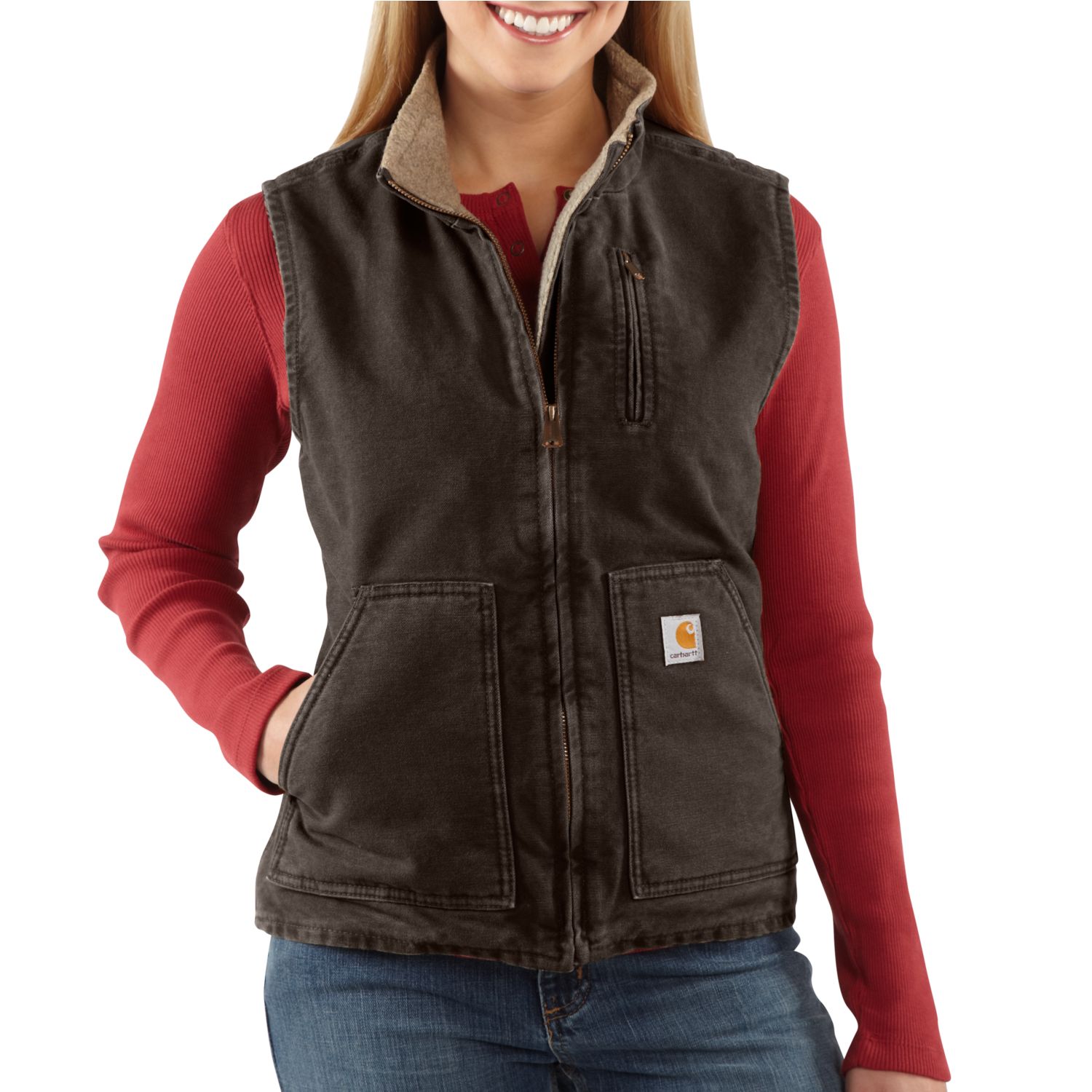 Style# WV001 Our sandstone mock-neck vest provides the ultimate in workwear comfort and durability. it's made of 12-ounce, 100% cotton sandstone duck and is sherpa-lined for warmth. It also features a left-chest map pocket with a zip closure, two large sherpa-lined front pockets, two inner pockets and a drop tail for added coverage in back.